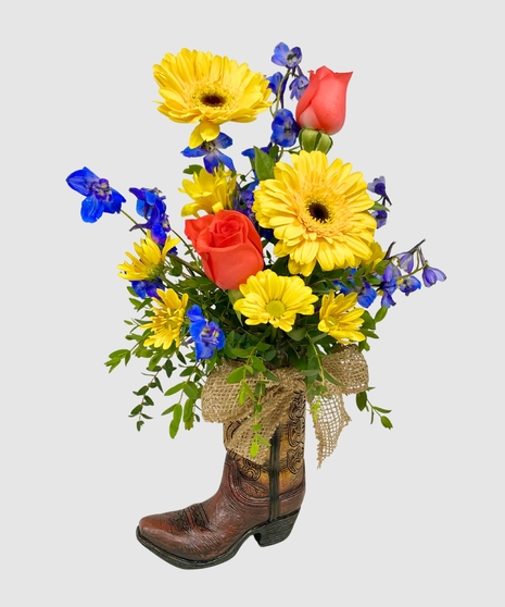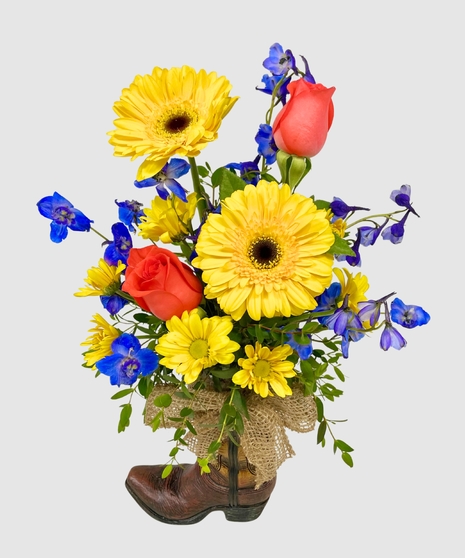 This vibrant arrangement brings the warmth of a desert sunset to any space. Nestled inside a charming, brown ceramic cowboy boot, the Blooming Boot Bank features bright yellow gerbera daisies and rich orange roses. Delicate blue delphiniums offer a striking sky-blue contrast, while yellow daisy poms and wispy eucalyptus provide a wild, natural texture.