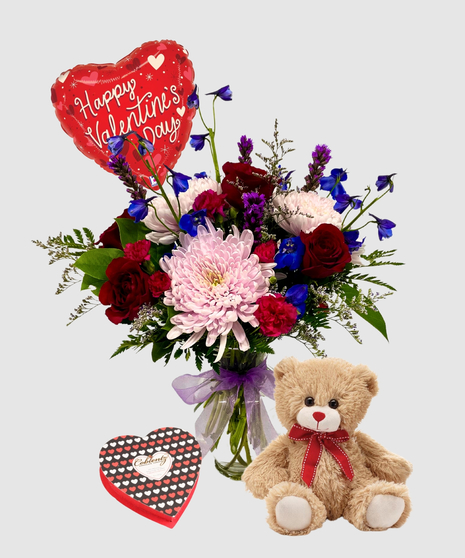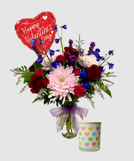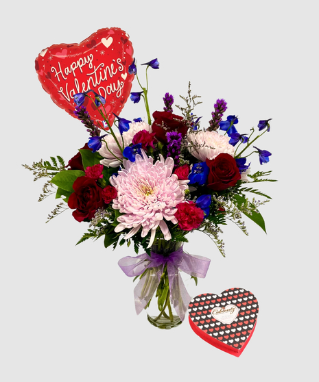 Celebrate love with an extraordinary display of vibrant blooms in Blooming in Love. A harmonious blend of lavender mum disbuds, rich red roses, and striking blue delphinium sets the stage for an unforgettable expression of affection. Cheerful hot pink mini carnations and elegant liatris add depth and texture, creating a bouquet that captures both romance and joy in perfect harmony.