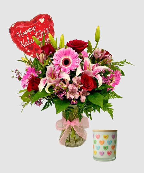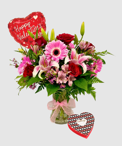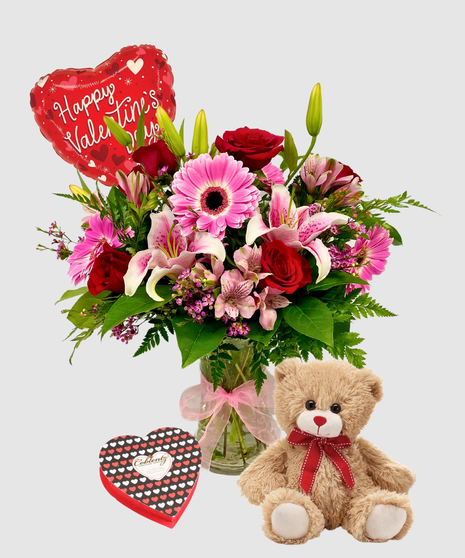 Whether it's a gift for a significant other, a family member, or a dear friend, this Valentine's Day flower arrangement is a perfect expression of affection and admiration. The combination of passionate reds and gentle pinks, along with the timeless beauty of roses, gerbera daisies, and lilies, makes for a truly enchanting and memorable gift that embodies the spirit of love on this special day.