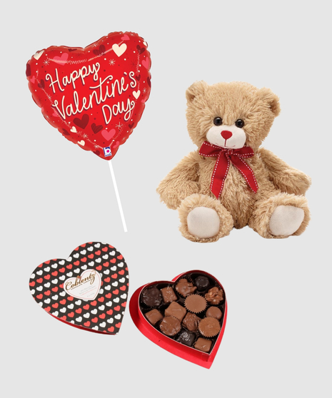 Premium - 1 Valentine's 9" Stick Balloon, 1 Teddy Bear Plush, 1 Box of Chocolates