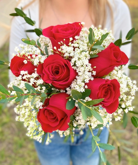 Capture a sense of classic charm with this light and airy arrangement. This bouquet features six premium roses nestled among a cloud of delicate baby's breath, creating a soft, romantic texture. The addition of fresh seasonal greenery provides a lush backdrop, framing the blooms and giving the bouquet a full, garden-fresh appearance.