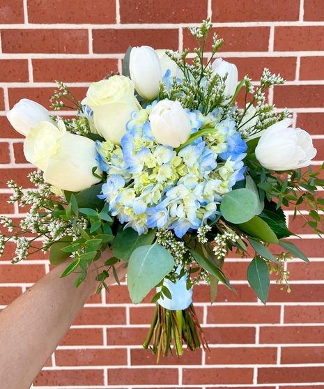 Cloud Nine is a wedding bouquet that embodies the light, airy romance of a perfect day. Lush blue hydrangeas form a soft, dreamy foundation, their delicate petals evoking the serenity of a clear sky. Pristine white roses and elegant white tulips rise gracefully among the hydrangeas, symbolizing purity, love and new beginnings, while tiny white filler flowers add gentle texture and depth. Sprigs of eucalyptus lend a fresh, modern touch and a subtle, soothing fragrance, completing the bouquet’s natural elegance.