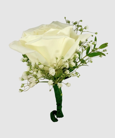 The design of the rose boutonniere is elegantly minimalistic. The rose is carefully trimmed and prepared, with any thorns removed, to ensure the wearer's comfort. The stem is usually cut to a suitable length, allowing it to be easily attached to a lapel. Traditionally, a single white rose is used but you may choose any color rose if available. Customize your boutonniere with your choice of ribbon color to match seamlessly with your partner.