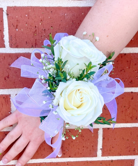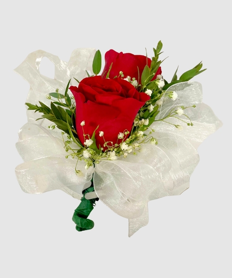 Although wrist corsages are most popular, this classic corsage can be worn as a pin on. Traditionally, corsages are made with 2 standard white roses, but can be made in any color roses if available. Customize your corsage with your choice of ribbon color to get the perfect match.