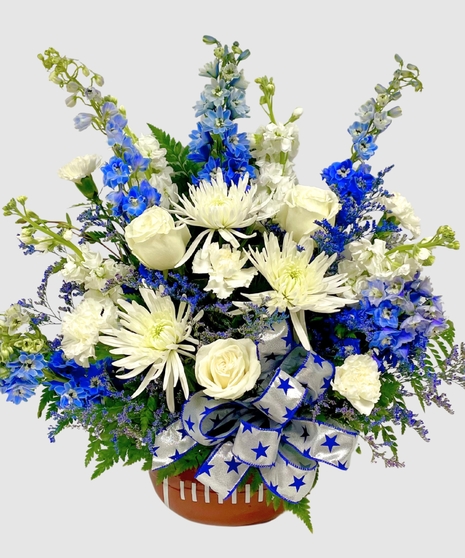 Show your team spirit with Cowboys Comfort, beautifully designed one-sided in a ceramic football container. Fresh blue delphinium stands tall among graceful white roses, mums, carnations and stock, accented with soft blue misty filler for a touch of texture and balance. A silver and blue bow adorned with blue stars completes the design, subtly honoring the colors and spirit of the Dallas Cowboys.