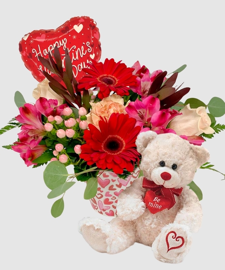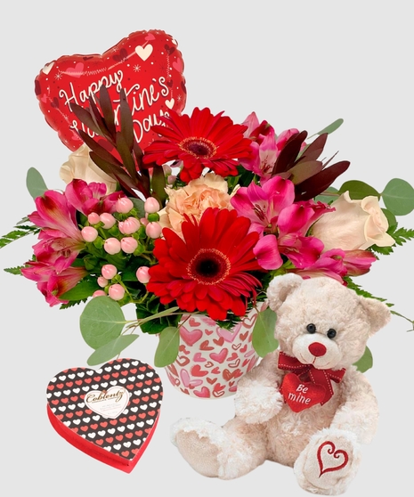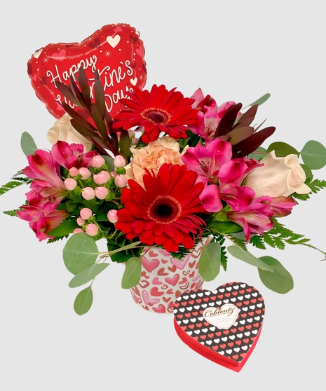 Cupid's Cutie is a small but meaningful way to share love. Bright red gerbera daisies take center stage, symbolizing deep affection, while cheerful safari sunset blooms add warmth and energy. Soft pink alstroemeria, classic roses, and delicate carnations bring balance and romance with their layered textures and loving hues.