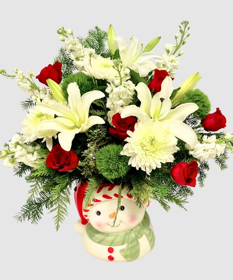 Set in a generously sized ceramic container shaped as either a cheerful Santa head or a smiling snowman, this arrangement instantly brings personality and warmth to any space. The festive container enhances the holiday spirit, making it a standout piece that delights both children and adults alike. Its one-sided style makes it ideal for placement against a wall, on a mantle or as a welcoming entryway display.