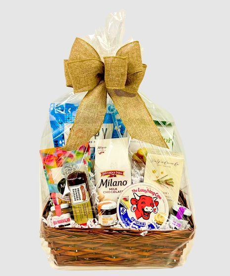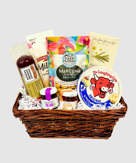 This elegant gourmet basket is a delightful assortment of savory and sweet treats, perfect for sharing or gifting. It features Milano cookies, creamy Laughing Cow cheese, flavorful jams, crisp crackers, crunchy bruschettini toasts, a variety of nuts, Poppy popcorn and premium summer sausage. Each item is carefully selected to create a balanced and indulgent collection that appeals to every palate.