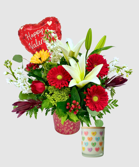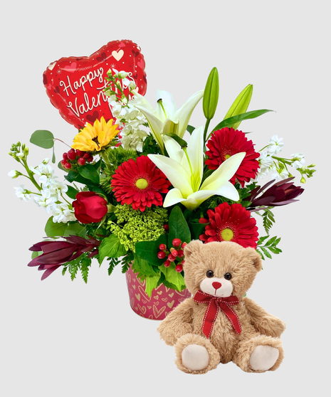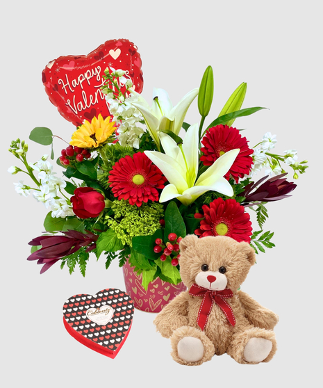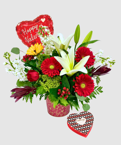Red Crush is a romantic Valentine’s arrangement that blends bold passion with elegant charm. Striking white lilies and soft white stock create a graceful backdrop for vibrant red gerbera daisies and a classic red rose—timeless symbols of love. Accents of red hypericum and warm safari sunset blooms add rich texture, while lush mini green hydrangeas provide balance and depth. A cheerful sunflower brings a touch of joy and brightness to the design.