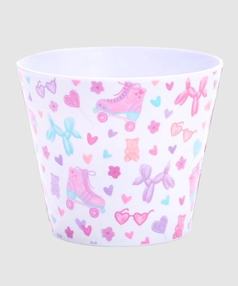 Set in a sturdy white melamine container, the base is adorned with pink, purple, and peach roller skates, playful balloon dogs, colorful lollipops, gummy bears, tiny hearts, sunglasses, and scattered miniature flowers—making every glance a delightful surprise.