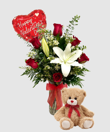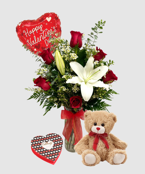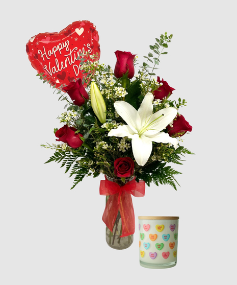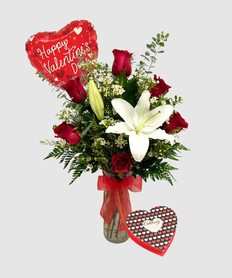 Our Perfect Passion arrangement is a captivating and harmonious blend of two of nature's most enchanting blooms. This stunning bouquet is a masterpiece of elegance, combining the timeless charm of roses with the graceful allure of lilies. Each element complements the other, creating a striking display that captures the essence of beauty and sophistication.