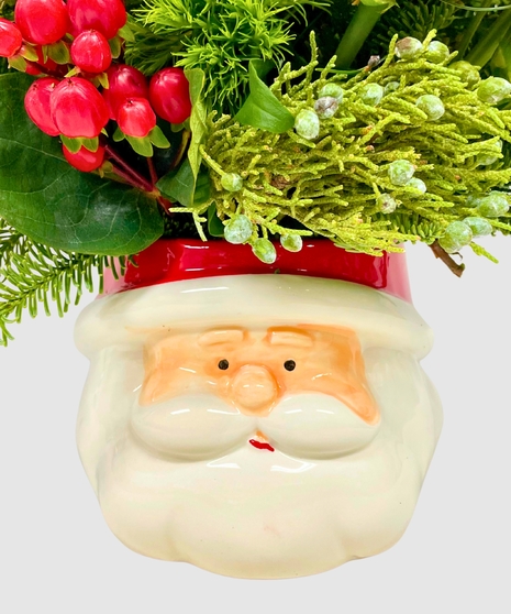 The entire bouquet is presented in a ceramic painted Santa container, adding a touch of whimsy and nostalgic joy. This festive piece makes a thoughtful holiday gift or a merry accent for your own décor, spreading warmth and celebration wherever it’s placed.