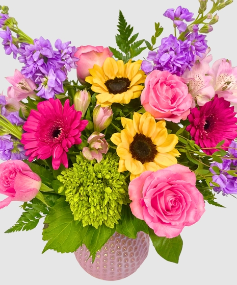 Spring Sorbet captures the essence of a sun-drenched garden, blending a cheerful palette of hot pink, sunny yellow and delicate lavender. Focal sunflowers and bold gerbera daisies radiate energy, while lush pink roses and fragrant lavender stock add layers of elegant texture. Striking mini green hydrangea provides a modern pop of contrast, all beautifully gathered in a chic, textured iridescent pink vase that shimmers with every turn.