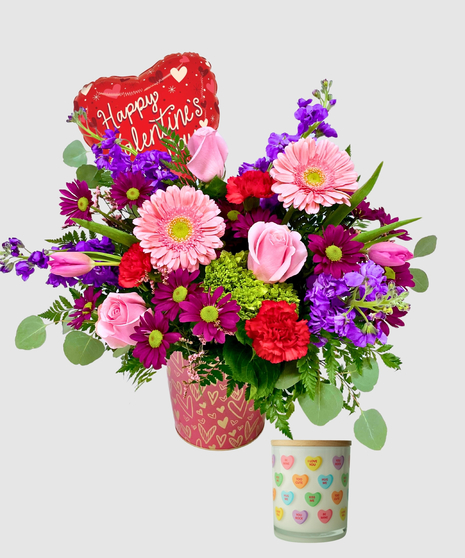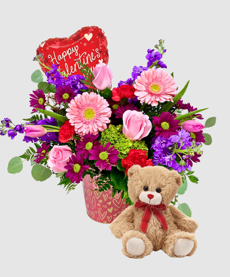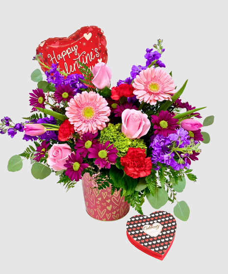 Arranged in a dark pink tin decorated with shimmering gold hearts, this design feels both modern and timeless. The rich pink container enhances the flowers’ colors while the gold heart details add a sweet Valentine’s sparkle. This charming keepsake tin makes the arrangement just as memorable as the blooms themselves.