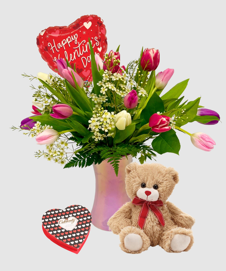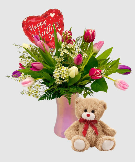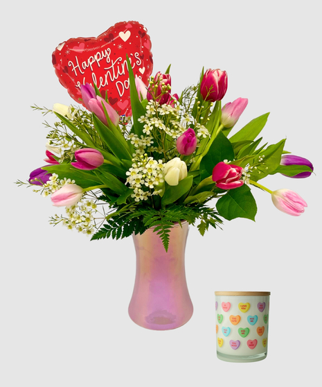 Celebrate love with our Sweetheart Tulips, featuring 20 fresh tulips in assorted Valentine's colors. Arranged in a charming pink vase, these vibrant blooms bring elegance and romance to any space, making it a perfect gift for someone special or a beautiful treat for yourself.