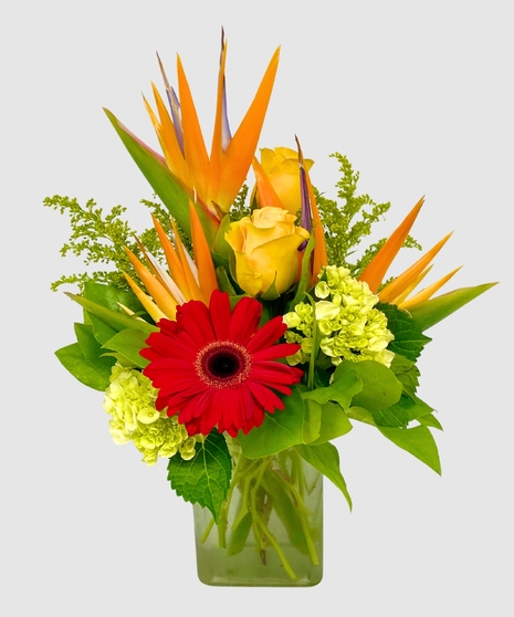Striking birds of paradise stand tall with their brilliant orange and blue hues, while sunny yellow roses and a radiant red gerbera daisy add warmth and cheer. The soft green tones of mini hydrangea and touches of solidago create a beautiful balance of color and texture, adding depth and freshness to the design.