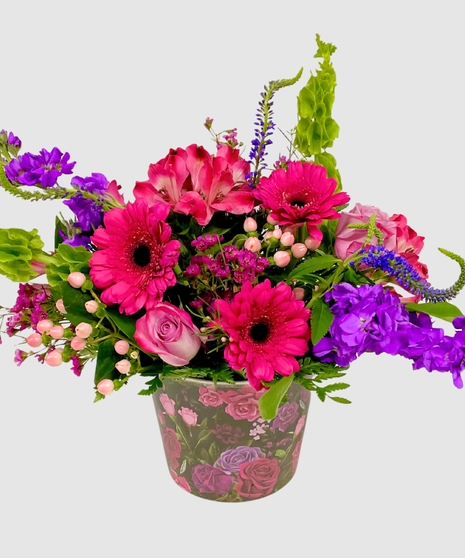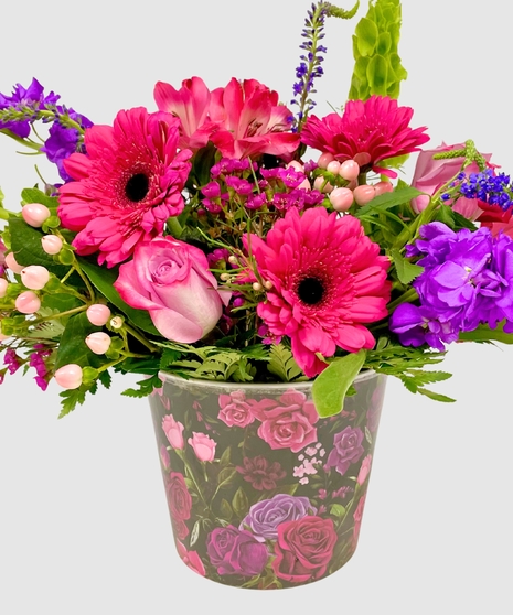 Designed in a dark floral-patterned pot, Velvet Blush feels dramatic yet refined. Perfect for birthdays, celebrations, or anyone who loves lush color palettes, this arrangement is a standout piece that brings elegance, charm, and modern flair to any space.