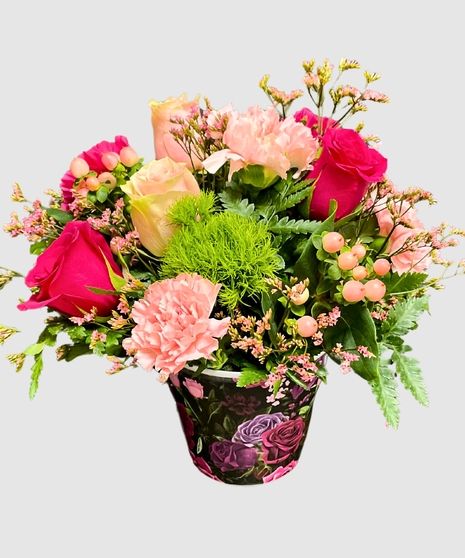 All of these exquisite blooms are artfully arranged in a sleek black pot, creating a striking contrast that makes the colors pop. The container is adorned with a dark pink and purple rose floral design, adding an extra layer of sophistication and romance. It’s a modern yet timeless piece that complements the vibrant tones of the flowers perfectly.