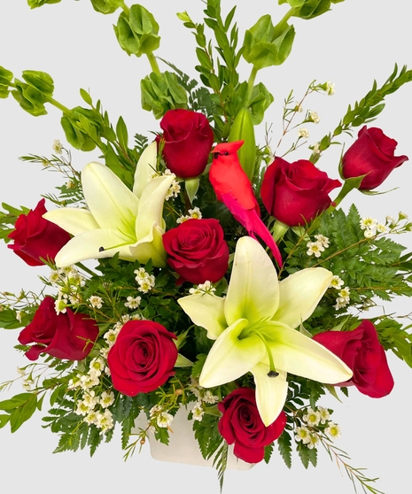 Together, this sympathy arrangement with red roses, white lilies, and the red cardinal serves as a poignant and thoughtful tribute. It conveys your deepest condolences, love, and support to those in mourning, offering a visual representation of the enduring connections that persist even in the face of loss.
