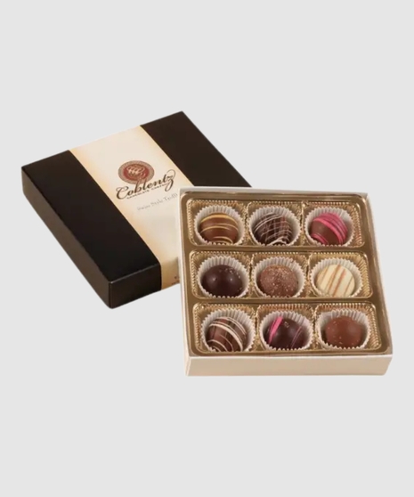 A best seller, this assorted box is filled with Coblentz favorites such as Caramels, Creams, Clusters, Meltaways and more. The Deluxe Assortment is mainly milk chocolate with a few dark chocolate bites. This box makes the perfect gift for any special occasion.