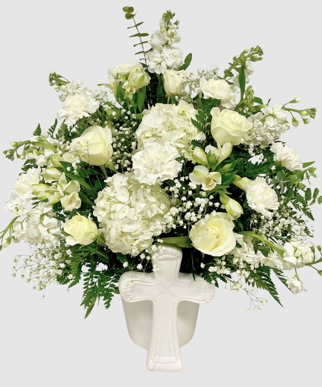 The ceramic cross container serves as a symbol of faith and hope, offering a meaningful representation of the departed's spiritual journey. The container's design adds a touch of reverence and reverence to the arrangement, creating a focal point that exudes compassion and support.